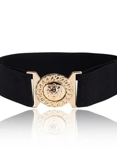 DAMSKI PASEK GUMOWANY REGULOWANY Z OZDOBNĄ ZŁOTĄ KLAMRĄ GŁOWA LWA CZARNY