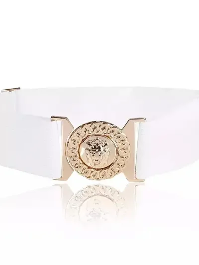 DAMSKI PASEK GUMOWANY REGULOWANY Z OZDOBNĄ ZŁOTĄ KLAMRĄ GŁOWA LWA BIAŁY