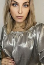 Bluzka damska w typie hiszpanki z ozdobnym rękawem, z poświatą złota, świetnie sprawdzi się na mniejsze i większe okazje tam gdzie trzeba błyszczeć.