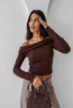 Bluzka z długim rękawem, o dopasowanym kroju z odkrytymi ramionami. Wykonana z elastycznego, prążkowanego materiału. Krótszy fason subtelnie podkreśla talię. Na boku wszyta metka z logo marki OLAVOGA.