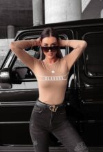 Podkreślający figurę top z długim rękawem. Na przodzie nadruk logo i minimalistyczna gwiazdka. Okrągły dekolt, prosty brzeg u dołu.