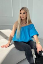 Popelinowa bluzka hiszpanka BG BUENA w kolorze niebieskim. Bluzka posiada wyhaftowane logo marki na rękawku w kolorze materiału. Letnia bluzka jest na lekkiej bawełnianej podszewce. Hiszpankę można nosić na prawe lub lewe ramię, według upodobań. Noś do szpilek, sandałek lub trampek !