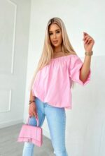 Popelinowa bluzka hiszpanka BG BUENA w kolorze różu. Bluzka posiada wyhaftowane logo marki na rękawku w kolorze materiału. Letnia bluzka jest na lekkiej bawełnianej podszewce. Hiszpankę można nosić na prawe lub lewe ramię, według upodobań. Noś do szpilek, sandałek lub trampek !