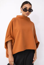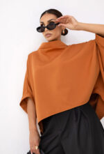 Oversize’owa bluzka w stylu kimono, uszyta przez polskiego producenta, to idealny wybór dla osób szukających wygody i stylu. Szerokie wykończenia dekoltu i rękawów w postaci lamówki nadają jej wyjątkowego charakteru. Dzięki prostemu fasonowi, bluzka pasuje do wielu różnych stylizacji – zarówno codziennych, jak i bardziej eleganckich. Świetnie komponuje się z jeansami, spódnicą, a także szortami, co daje wiele możliwości do stworzenia modnych i komfortowych zestawów.