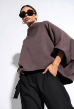 Oversize’owa bluzka w stylu kimono, uszyta przez polskiego producenta, to idealny wybór dla osób szukających wygody i stylu. Szerokie wykończenia dekoltu i rękawów w postaci lamówki nadają jej wyjątkowego charakteru. Dzięki prostemu fasonowi, bluzka pasuje do wielu różnych stylizacji – zarówno codziennych, jak i bardziej eleganckich. Świetnie komponuje się z jeansami, spódnicą, a także szortami, co daje wiele możliwości do stworzenia modnych i komfortowych zestawów.