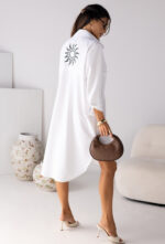 Długa koszula lniana w stylu sukienki, zapinana na guziki na całej długości. Z tyłu sukienki ozdobny print słońca.