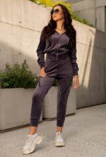 Komplet dresowy madame she wykonany z wysokiej jakości weluru. Na bluzie oraz na nogawce ozdobne kontrastowe wstawki z eko skóry. Spodnie posiadają kieszenie, buza zapinana na suwak. Model niezwykle elegancki. Idealny do adidasów lub do szpilek.