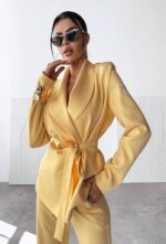 Elegancki komplet damski wykonany wykonany z wysokiej jakości garniturowego materiału. Góra – klasyczna, taliowana marynarka z wiązaniem w talii. Poduszki na ramionach dodające klasy. Na jednym z rękawów naszywka z logo marki OLAVOGA. Dół – casualowe spodnie z nogawkami rozszerzanymi ku dołowi, wiązane przy kostce. Po bokach kieszenie. Wysoki stan. Nogawki rozszerzane ku dołowi. W talii logowana naszywka.