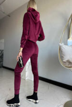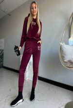 Welurowy komplet dresowy Marina w kolorze bordowym to popularny wybór łączący wygodę z eleganckim, połyskującym wykończeniem charakterystycznym dla weluru. Zestaw ten składa się z bluzy ( z kapturem i złotym haftem) oraz dopasowanych spodni z wysokim stanem.