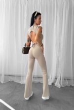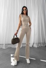Spodnie damskie, wykonany z wysokiej jakości elastycznej bawełny. Góra – idealnie przylegający top bez rękawów. Tył posiada rozcięcie na plecach z regulowaną talią. Na przodzie haft z logo marki OLAVOGA z odpowiadającym mu wariantem kolorystycznym. Dół – spodnie z regulowaną talią. Nogawki rozszerzane ku dołowi. Na przodzie minimalistyczny haft z logo brandu.