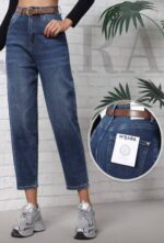 Spodnie jeansowe wykonane z lekko elastycznej tkaniny. To model o kroju ballon z wysokim stanem, posiadający użytkowe kieszenie z przodu oraz z tyłu. Spodnie zapinane na suwak oraz guzik. Do zestawu dołączono pasek z klamrą.
