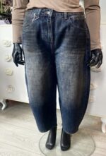 Spodnie jeansowe wykonane z przyjemnej tkaniny. To model o kroju ballon z wysokim stanem, posiadający użytkowe kieszenie z przodu oraz z tyłu. Spodnie zapinane na suwak oraz guzik. Do zestawu dołączono pasek z klamrą.