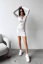 Idealnie przylegająca sukienka z długim rękawem. Wykonana z wysokiej jakości materiału z domieszką wiskozy. Dekolt regulowany poprzez kontrastowy suwak. Na rękawach obszerne logo marki OLAVOGA.