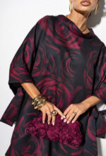 Całość dopełnia efektowny print z motywem róż, który wprowadza romantyczny akcent i przyciąga spojrzenia. To model idealny zarówno na co dzień, jak i na specjalne okazje – wystarczy zmienić dodatki, by stworzyć zupełnie nową stylizację.