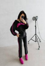 Sportowy komplet wykonany z miękko w dotyku weluru. Góra – bluza o krótszym, lekko oversize’owym kroju, zapinana na suwak. Model z kapturem oraz obniżoną linią ramion. Rękawy zakończone elastycznymi ściągaczami. Wzdłuż rękawów kontrastowe lampasy. Na przodzie wyrazista, haftowana aplikacja OLAVOGA. Dół – spodnie o prostym, swobodnym kroju z elastycznym pasem. Nogawki wykończone delikatnym ściągaczem. Po bokach kontrastowe lampasy nawiązujące do bluzy, tworzące spójną całość.